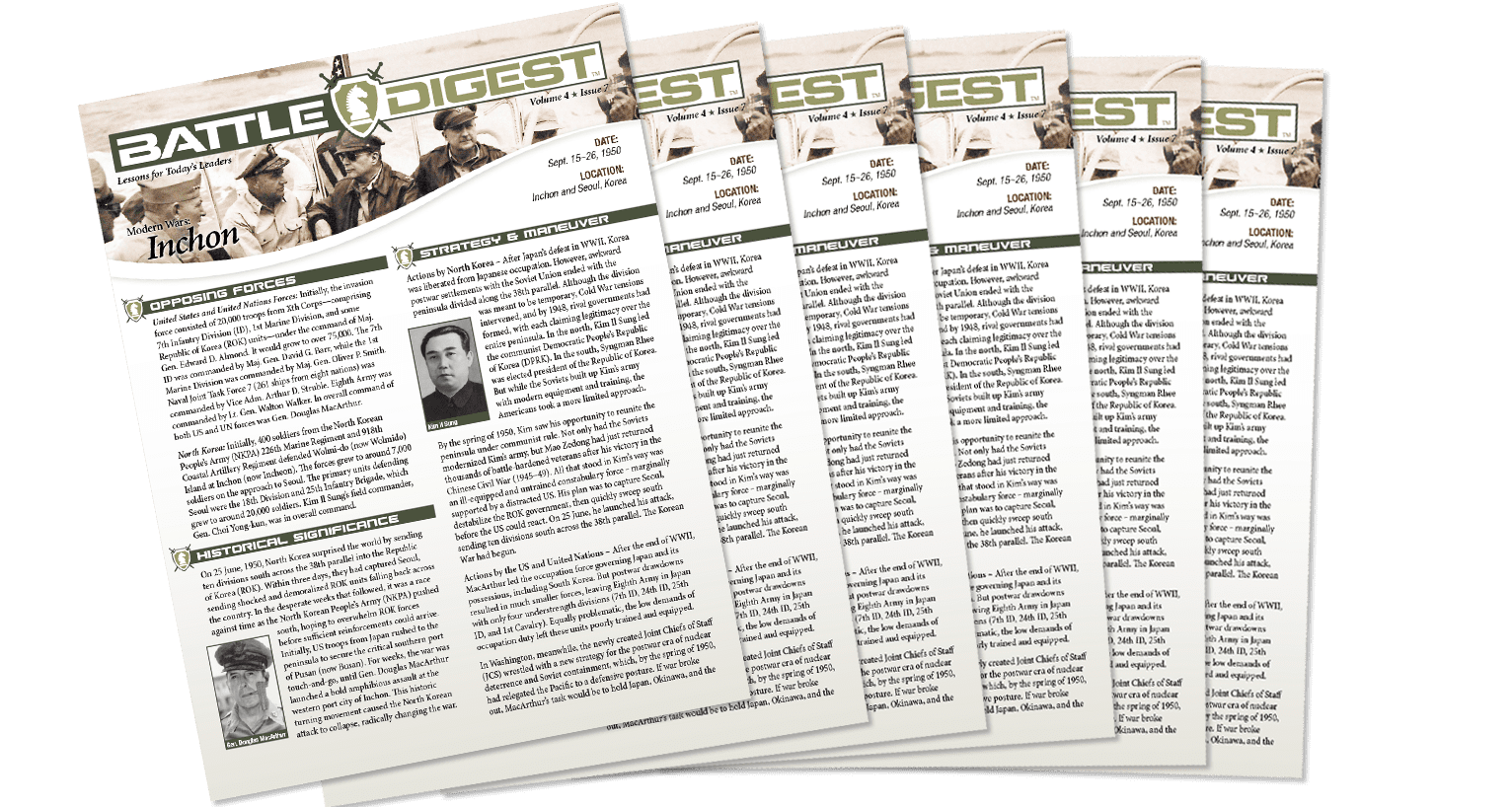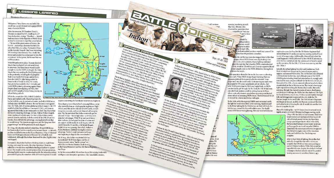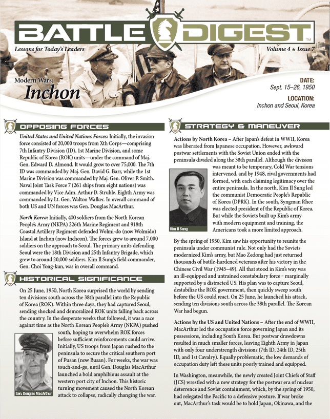 The Inchon summary is a professional quality, glossy, tri-fold brochure summarizing all key aspects of the battle. It also includes important lessons on strategy, tactics, and leadership. Request your copy today.